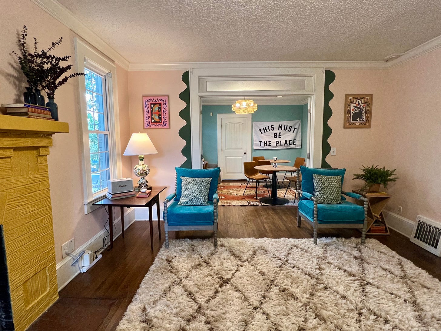 But now! Now the walls are blush pink, teal green, lavender, and denim blue. Living, green pothos trails from the mantle. Colorful textiles dot the burnt orange sofa and emerald velvet chairs. An antique Olivetti typewriter waits on the desk.