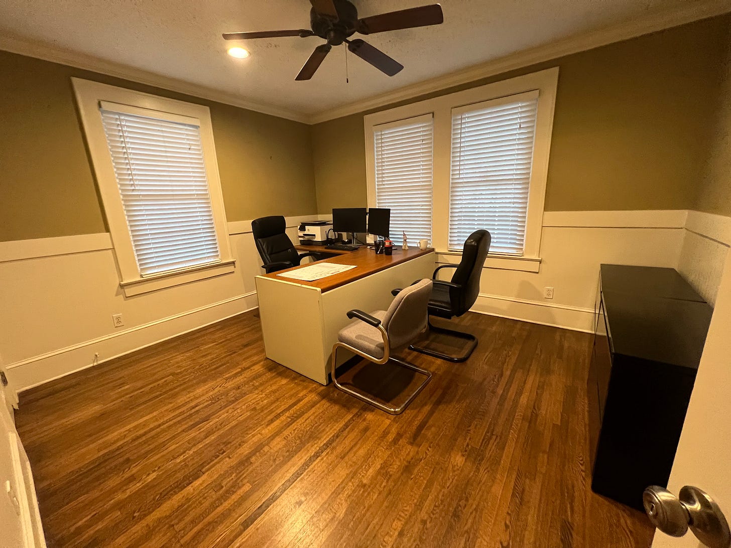 Picture, if you will, Dunder Mifflin, Inc. When I first saw the place, it was all shades of tan, featureless save the life-sized cardboard cut-out of “State Farm Jake” in the corner, whose crewneck sweater contributed a spark of State Farm red. On the dry erase board were the words “Good Neighbor Notes,” a few sad Post-Its floating in the white space. The ceiling fans, mantel, and budget window blinds had never, ever been dusted.